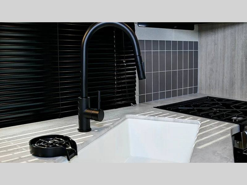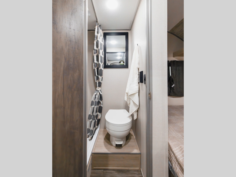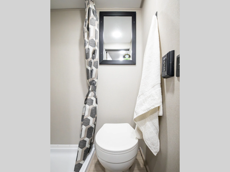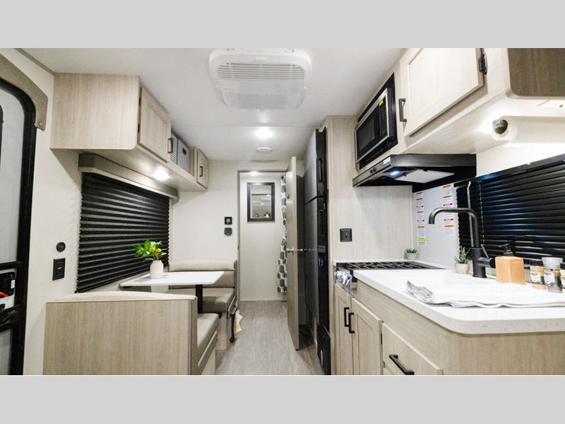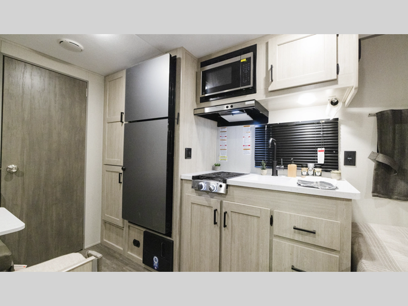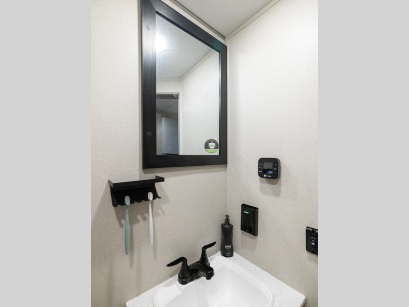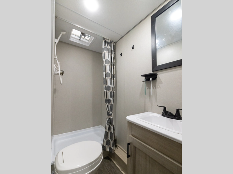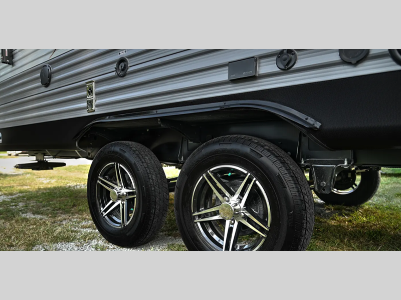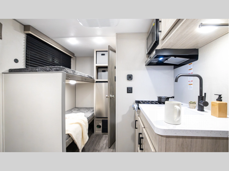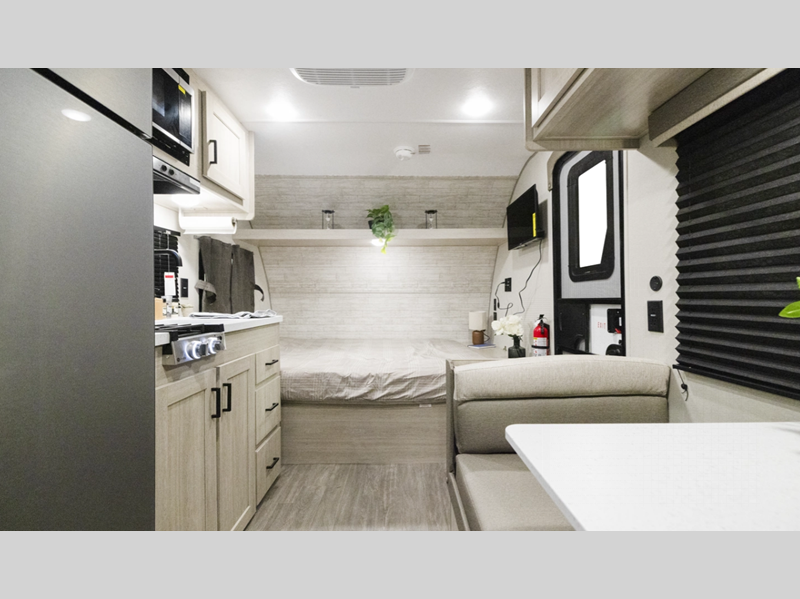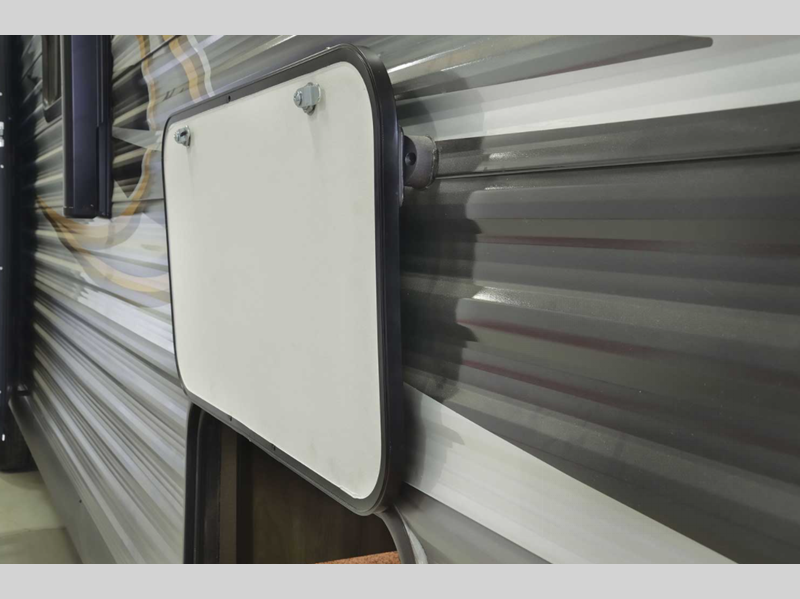 A seamless roof membrane, full length frame E-coated outriggers, and 2' x 3' floor joists on approximately 12" centers with horizontal support studs hold these units together. The water heater by-pass winterization kit gives you the ability to camp all year round, and you will love the smooth aluminum radius front for a sleek look. Inside, you'll enjoy black nightshades in the living room, GE kitchen appliances, and many more comforts!