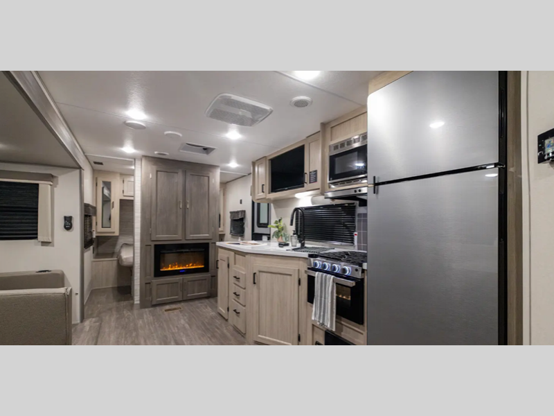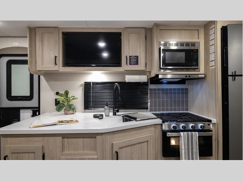 A seamless roof membrane, full length frame E-coated outriggers, and 2' x 3' floor joists on approximately 12" centers with horizontal support studs hold these units together. The water heater by-pass winterization kit helps extend your camping season, and you will love the smooth aluminum radius front for a sleek look. You'll love the GE kitchen appliances and carpet-free interior for easy cleaning, plus there is a JBL entertainment package to wash away those rainy-day blues!