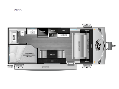 This travel trailer features compact sleeping spaces thanks to the double-size bunk beds in the rear corner, and the private full bath is right next to the bunks for easy nighttime use! You'll have the front Murphy bed all to yourselves, and in the morning, you can fold it away to sit on the jack-knife sofa. A three-burner cooktop and microwave oven will let you make meals each day, and there is a 12V refrigerator to keep your cold items fresh. Outside, you'll enjoy the 13' power awning with LED lights for added shade, and there are two exterior storage compartments to keep fishing poles, hiking gear and more!