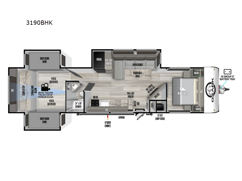 Trips to the lake just got sweeter in this travel trailer with a large slide in the living room for more space. Here, you'll find an L-shaped open lounge with a removable table, and the entertainment center with a fireplace will make it feel a little more like home. A full bath with a 24' x 36" shower will let you clean up each day without having to use the camp's facilities, and the rear bunkhouse will provide sleeping space for your guests or kids. There are dual opposing slides here, two Versa queen beds and two drop-down bunks. There is also a rear countertop with storage and a movie theater projector with premium sound for movie nights. Head up front to enjoy the private bedroom all to yourselves with a king bed and dual wardrobes for wrinkle-free clothes!